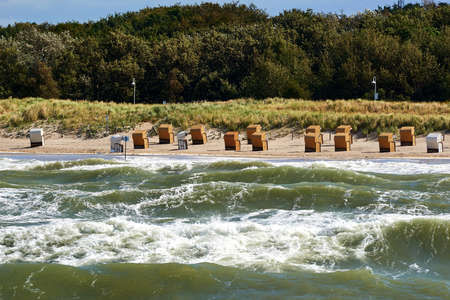 Traditional German roofed wicker beach chairs on the beach of Baltic sea. Beach with chairs on stormy day. Ostsee.