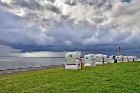 white beach chairs at the north sea coast with storm clouds in the background