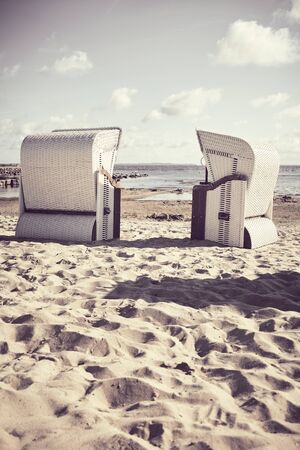 Lonely beach wooden wicker chairs on beach Baltic Sea, Germany