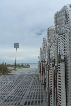 Wicker chairs on wooden terrace on beach in Wenningstedt village on Sylt island, North Sea, Germany