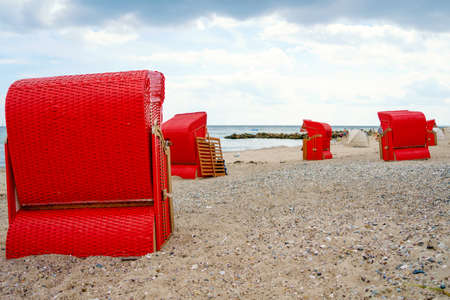 Traditional German roofed wicker beach chairs on the beach of Baltic Sea. Beach with red chairs on stormy sunny day. Ostsee.