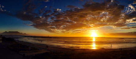 Photographed on a West coast facing beach in Cape Town South Africa. Rough waves at sunset on a sandy beach with reflections on the water