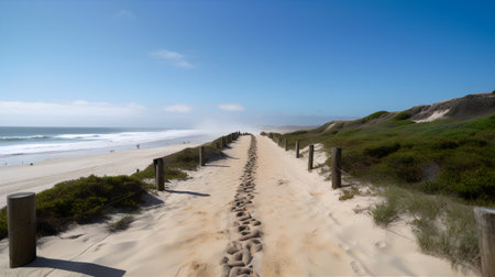 A picturesque coastal pathway lined with vibrant wildflowers, leading to a stunning ocean view beneath a clear blue sky, inviting exploration and serenity.