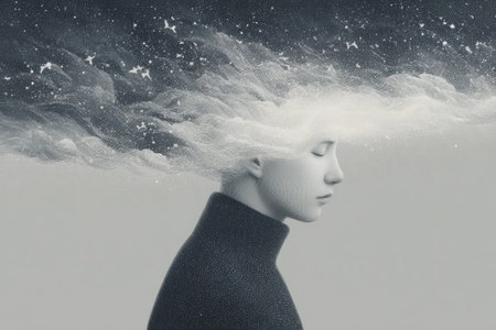 a surreal portrait of a man whose face is partially obscured by clouds, creating a dreamy atmosphere.