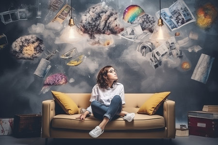 An AI generated illustration of A young woman is laying down in a peaceful pose, atop a bed of fluffy white clouds in a clear blue sky