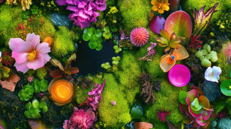 A stunning top view of a vibrant floral arrangement surrounded by lush green moss, showcasing an array of colorful blooms and rich textures, ideal for nature enthusiasts.