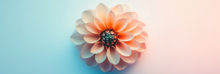 Soft pink and cream dahlia petals radiate elegance against a serene blue and peach gradient background, highlighting floral beauty.