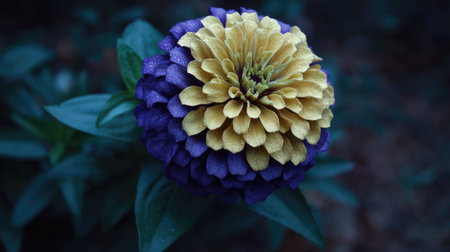 Captivating close-up image of a zinnia flower, showcasing its intricate petals in shades of purple and yellow. The flower is in sharp focus, with water droplets appearing on its petals. The background is softly blurred, drawing attention to the flower's detail and vibrant colors.