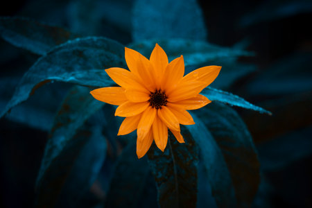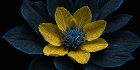 Black and yellow flower with blue petals on a black background.