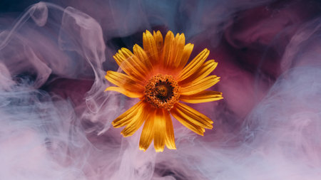 Steam flower. Paint wave. Defocused yellow color plant wet nature pink smoke water floating on abstract art dark black background.