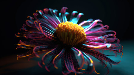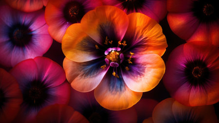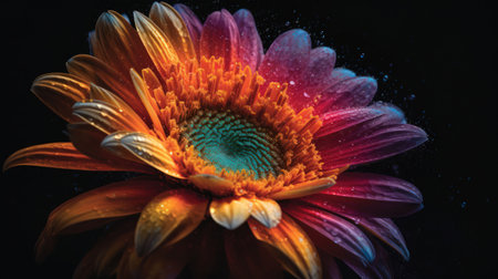 flower bloom with a gradient of vibrant purple, red, yellow, and orange tones against a dark . Generative AI