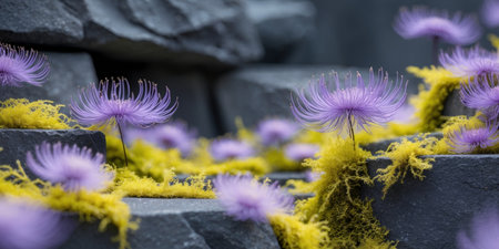 AI Generated. Purple Flowers Bloom on Dark Stone with Yellow Moss in an Abstract Botanical Scene