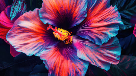 Close-up of a striking tropical hibiscus with bold, intricate coloring.