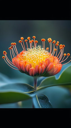 Intricate macro image showcases a Leucospermum flower featuring vibrant orange petals, a dense cluster of white and yellow stamens, and distinctive, elongated styles with orange tips.