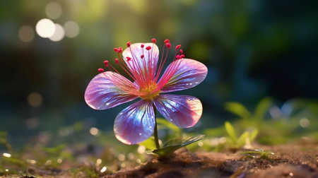 Amidst a dreamlike garden, a vibrant flower with radiant hues of pink, orange, and blue takes center stage, surrounded by a magical bloom of colors.