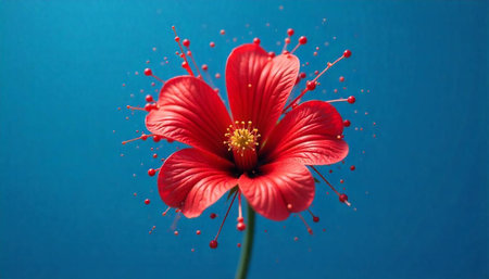 Vibrant red flower blossom with water droplets on turquoise