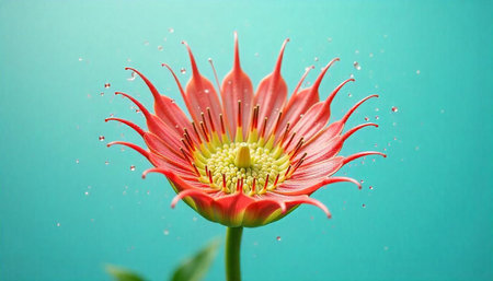 Vibrant red flower against a teal background with droplets