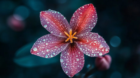 A flower with dew drops on its petals against a dark background, with the droplets reflecting light and adding a sense of depth and richness to the image.