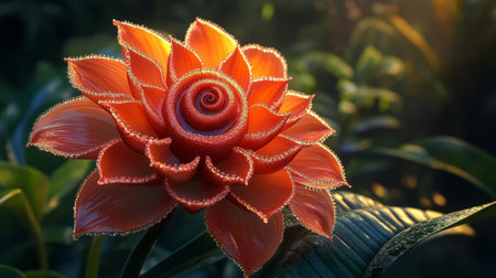 Rare exotic flower with spiral-shaped petals, covered in morning dew, shining under the warm sunlight. generative ai