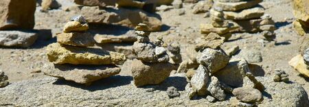 Small stones stacked in pyramids on large cobblestones, zen and balance in nature