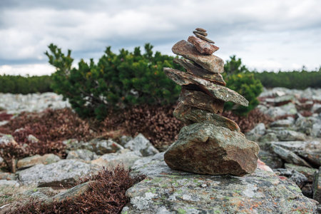 Rock stones stacked in a pyramid against a background of juniper. Meditation stones symbolizing the spirit of Zen. High quality photo
