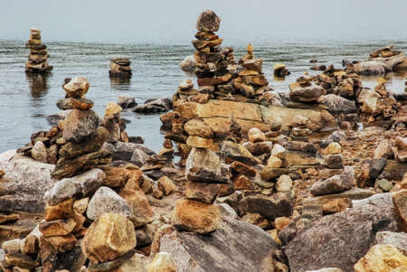 Pyramids of stones stacked by tourists create an interesting Norwegian landscape. . Scandinavia, fjord, Norway.
