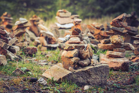 A stacked pile of stones in the forest. Tourists following the hiking trail add their stones to form numerous piles.