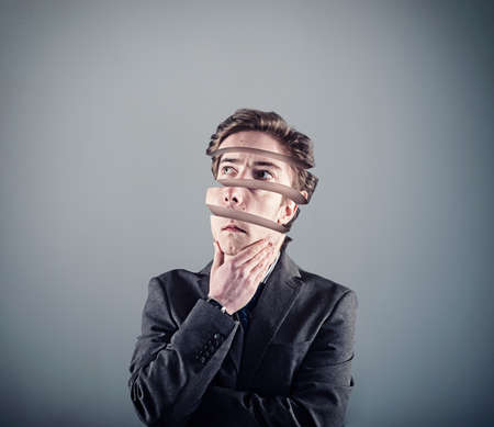Model with glued mouth. Man covers woman mouth with tape. Stop talking