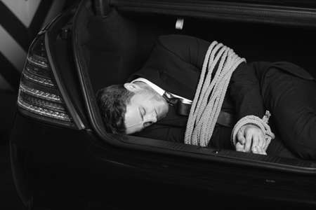 Kidnapped businessman. Black And White image of tied up young men lying in the car trunk