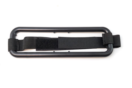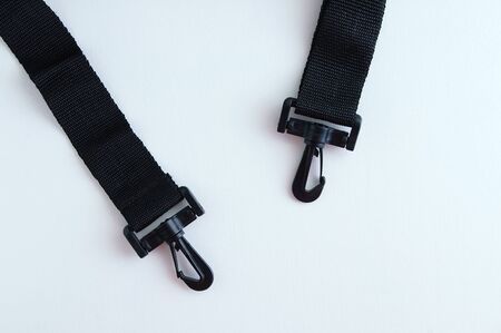 Close-up black textile handle for a bag with plastic carabiners.