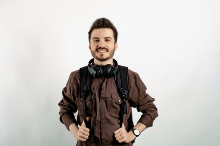Handsome young man wearing casual clothes posing isolated over white background posing education in high school university college concept.