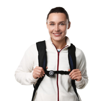 Young female tourist with backpack isolated on white