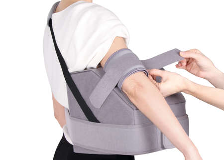 Broken arm. Arm Sling therapy support and covered around elbow first knuckle broken arm. Post Operative Care. Fractures of humerus radius ulna scapula. Arm Sling after accident. Isolated background.