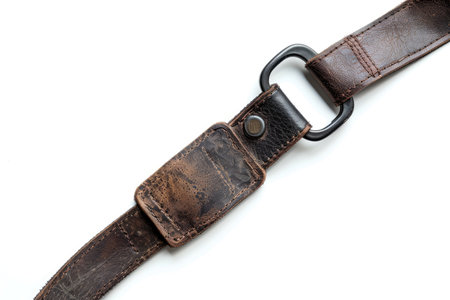black leather camera strap on white background.
