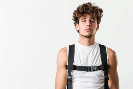 Man wearing posture corrector on white background, promoting good health and alignment