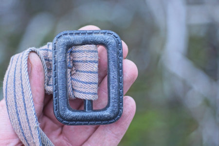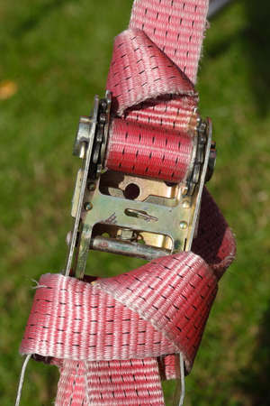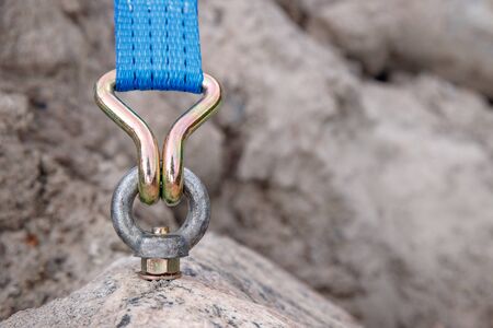Close-up of ratchet strap with its corresponding hooks to ensure dangerous loads and avoid danger of falls due to lack of support