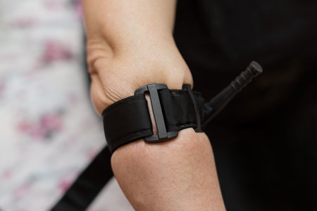 Vertical cropped shot of person taking care of wearable technology device, cleaning smartwatch sensor with soft cloth, ensuring hygiene and proper maintenance of personal electronic gadget for use.
