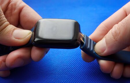 Man removes the silicone strap from the smart watch for charging on dark blue