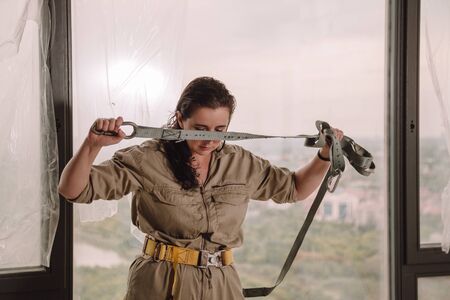 Nice girl in gray overalls holds in her hands a safety belt with a carbine on the background of the window. Outside the window a beautiful view and a white spot