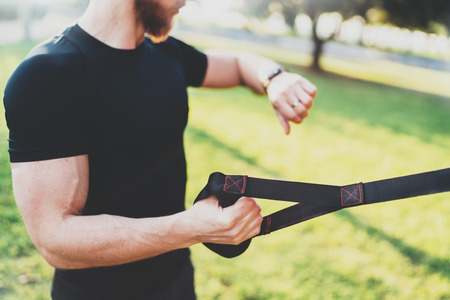 Healthy smart lifestyle concept.Muscular athlete doing great exercising TRX outside in sunny park.Young handsome man in sportswear checking sport tracker watch.Selective focus on hand.Blurred.