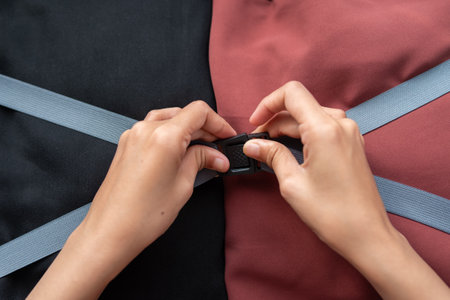 Focused shot of hands stretching and testing polymer blend material that autonomously repairs tears for longlasting durability in active wear