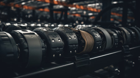 This vibrant stock photo features four sleek black wristbands arranged on a bright orange background, perfect for showcasing modern accessories and designs.