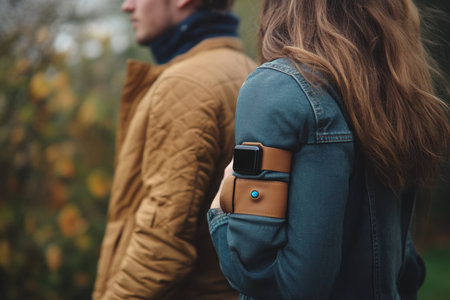 Two people outdoors observe their surroundings while using wearable tech among autumn foliage.