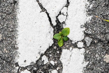 Green grass sprouts from a crack in the asphalt. Cracked rough sidewalk. Artistic noise. Crack in the asphalt. New life breaks through the asphalt. Green grass grows from crack. Old asphalt texture