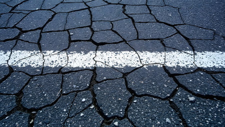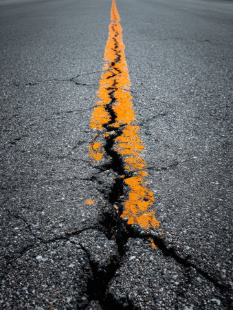 Close-up view of a cracked asphalt road featuring a prominent yellow line under an overcast sky, illustrating urban deterioration and nature's impact on infrastructure.
