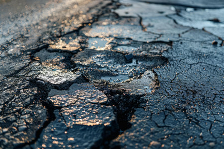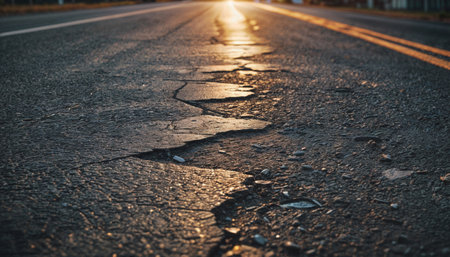 Closeup of a cracked asphalt surface glistening with the golden hues of sunset