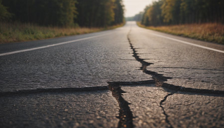 A close-up view of a cracked road surface illustrating the impact of natural disaster, with faded vehicles and a blurred forest backdrop, symbolizing environmental changes.