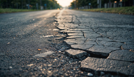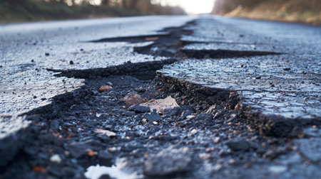 Damaged asphalt street with deep cracks and crumbling edges, shot from a low angle