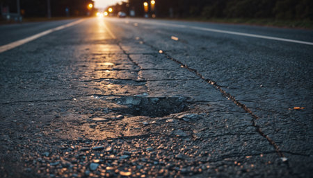 A close-up view of a crack in the asphalt on an urban street, highlighting wear and tear, with soft bokeh lights of vehicles in the background.