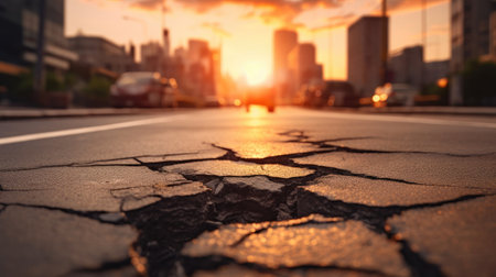 Cracked Road In Vibrant City: A Symbolic Reminder Of Earthquake Aftermath, With Space For Copy. Concept Golden Sunset Over A Calm Ocean, Majestic Mountain Range, Serene Forest Path.